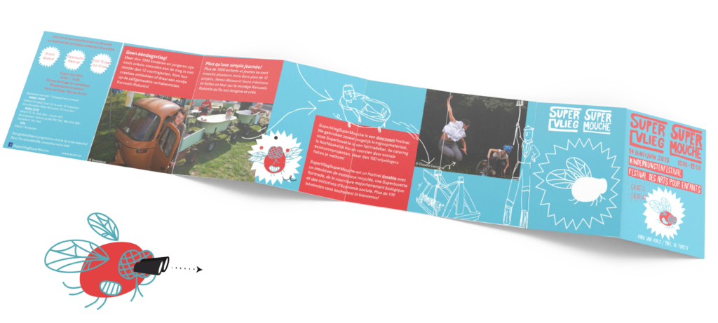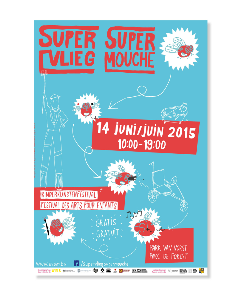 Een opgefriste huisstijl voor editie 2015 van het SupervliegSupermouche Festival. Een appelblauwzeegroen werd gemixt met een knallend rood, voor een bruisende, inspirerende en verrassende nieuwe editie van dit fijne kinderkunstenfestival.
